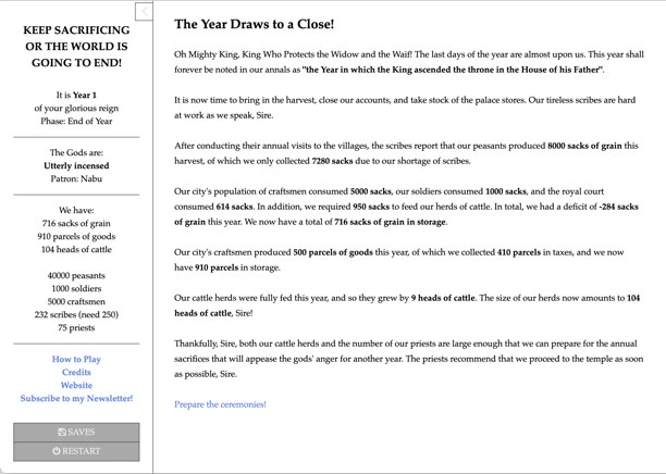 A text-based resource management game, made in Twine, in which you play as the king of a vaguely Sumerian/Akkadian city state. As king of a vaguely Sumerian/Akkadian city state, you have One Job: Perform the annual sacrifices to the gods. The gods are extremely angry all the time and will destroy the world if not regularly appeased, and since all the other city states do their sacrifices incorrectly, it's all up to you. Good luck.